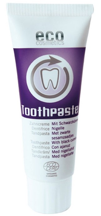 Eco Cosmetics tandkräm innehåller nigellafröolja, ett frö som länge använts i orienten som krydda och för att stärka immunförsvaret. Nigellafröoljan innehåller fleromättade fettsyror. Tandkrämen innehåller även salvia, grönt te och kiselmineraler. Utan fluor.