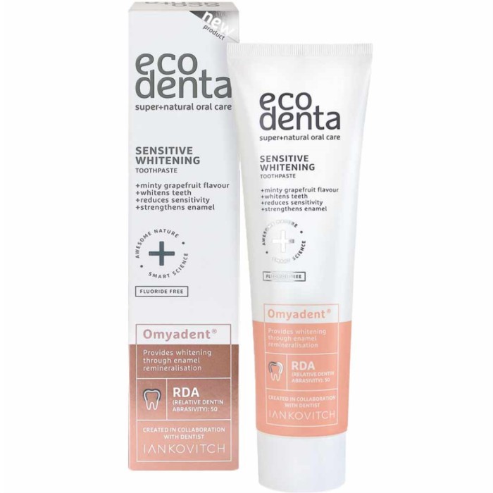 Ecodenta Sensitive Whitening Omyadent är en tandkräm utan fluor. Denna blekande tandkräm med Minty Grapefruit + Omyadent® är formulerad för att vara skonsam men effektivt blekande även för med känsliga tänder eller porslinsfasader.