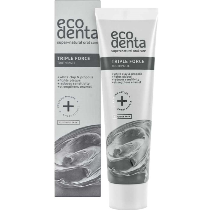 Ecodenta Triple Force Toothpaste är en tandkräm utan fluor. Tandkrämen innehåller vit lera, propolis och Teavigo™.