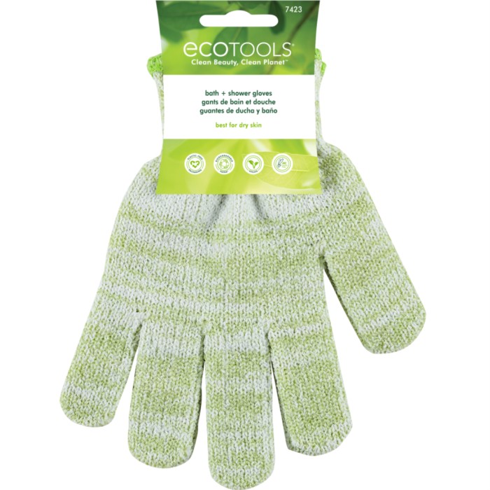 EcoTools Bath & Shower Gloves är exfolierande duschhandskar gjorda för att ge en peeling till huden på kroppen. Anpassade för torr hud och är designade med en loofah-liknande textur för en noggrann rengöring och för att skonsamt ta bort döda hudceller.