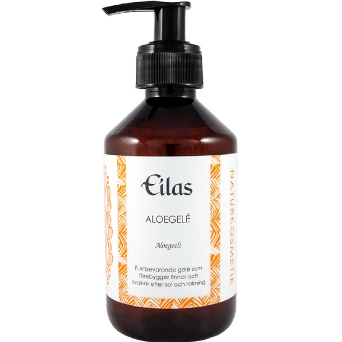 Eilas Aloegele är en fuktbevarande och klådstillande gel med aloe vera. Aloe vera har en lugnande och återuppbyggande verkan på huden. Aloe veran i Eilas gel är dubbelt koncentrerad, antiseptisk och antibakteriell.