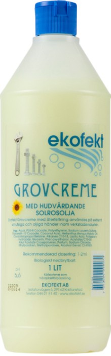 Ekofekt Grovcreme är en handrengöring som används på extremt smutsiga och oljiga händer för att ta bort t ex diesel och tjära. Grovcreme innehåller återfettningsmedel. Är biologiskt nedbrytningsbar och innehåller skrubb från ricinbusken. Innehåller inga aromatiska lösningsmedel. PH 6,6.