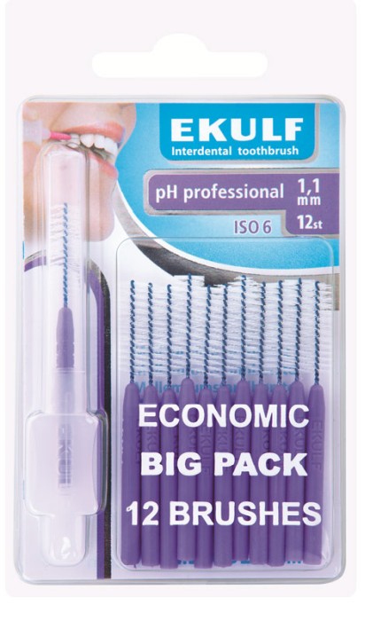 Ekulf PH Professional är en mellanrumsborste av hög kvalitet, gjord av DuPont Tynex fiber och med 400-600 st borsstrån per borste. Metalltråden i borsten är plastbelagd för att skydda tänderna.