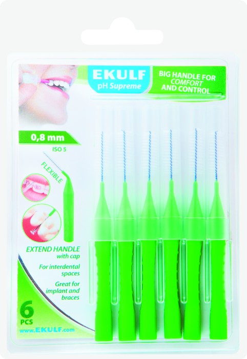 Ekulf PH Supreme 0,8 mm är avsedd för de som vill ha lite större grepp på sina mellanrumstandborstar. Borstarna är cylindriskt utformade och har hög kvalité på borst- och rengöringsförmåga.