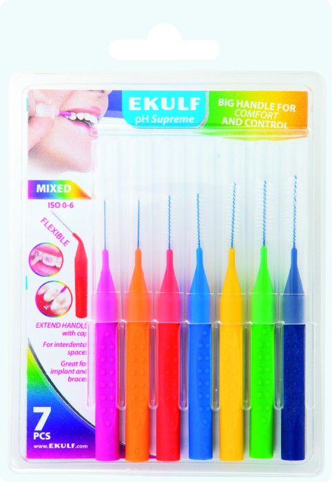 Ekulf PH Supreme Mixed är avsedd för de som vill ha lite större grepp på sina mellanrumstandborstar. Borstarna är cylindriskt utformade och har hög kvalité på borst- och rengöringsförmåga. Alla borstarna har olika storlek och passar därför alltid någon i familjen. Kan också köpas som ett startpaket för att testa dig fram till vilken storlek som passar just dig bäst.