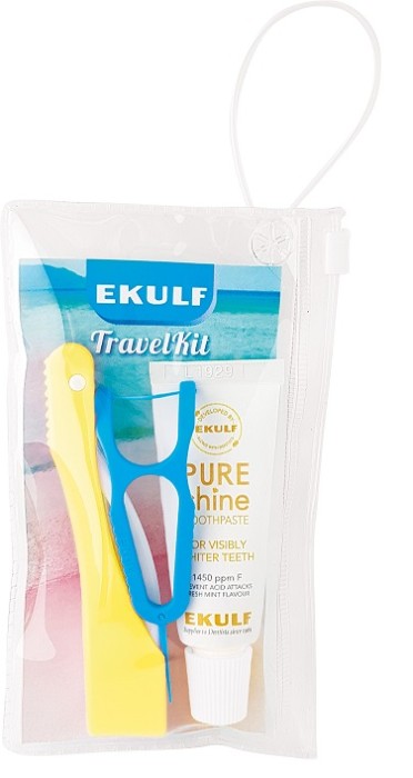 Ekulf TravelKit innehåller en hopfällbar tandborste (Ekulf TravelBrush), Ekulf Pure Shine tandkräm i minitub 10 ml och en Ekulf BeTweeners tandtrådsbygel.