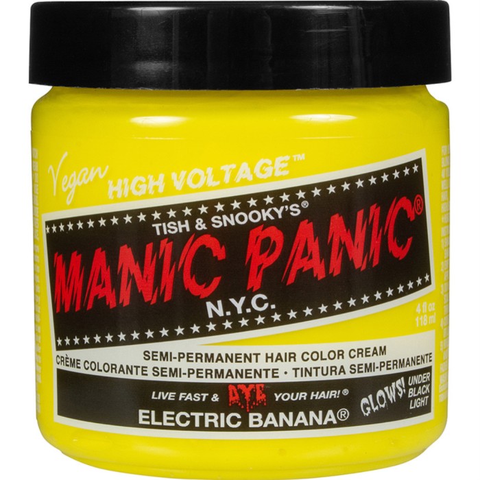 Semipermanent hårfärg från Manic Panic i färgen Electric Banana. Electric Banana är en ljus, neon-gul hårfärg som reflekterar något grönt i solljus och lyser under UV-ljus. Den här hårfärgen rekommenderas att användas i ljusblont hår. Mörkare nyanser kan ge fantastiska ljusa slingor i mörkare hår.