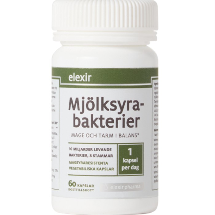 Elexir Mjölksyrabakterier är ett kosttillskott med 10 miljarder mjölksyrabakterier per kapsel. Bakterierna kommer från 8 olika stammar för att erbjuda ett brett spektrum. Kapslarna innehåller dessutom växtfibrer från majs, samt kalcium som bidrar till matsmältningsenzymernas normala funktion. Kapselskalet är magsyraresistent så att bakterierna kan passera magsäckens sura pH och nå tarmen.