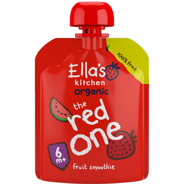 Ella's Kitchens smoothie passar som en del av frukosten, mellanmålet eller som efterätt. SmoothienThe Red One innehåller jordgubbar, hallon, äpple och banan, samt lite citronjuice. Smoothien innehåller inga tillsatser - inte ens vatten - och alla ingredienser är ekologiska.