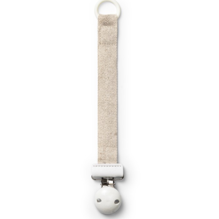 Napphållaren från Elodie är en praktisk liten hjälpreda i vardagen med små barn. Du fäster metallspännet i barnets kläder och silikonringen på nappen - och när nappen trillar ur bebisens mun är napphållaren där och fångar upp den. Spännet är tillverkat av rostfritt och nickelfritt stål och har en sköld av lackerat trä. Ringen är gjord av livsmedelsklassad silikon, och själva bandet är gjort av bomull och har dekorativa detaljer i veganskt läder.