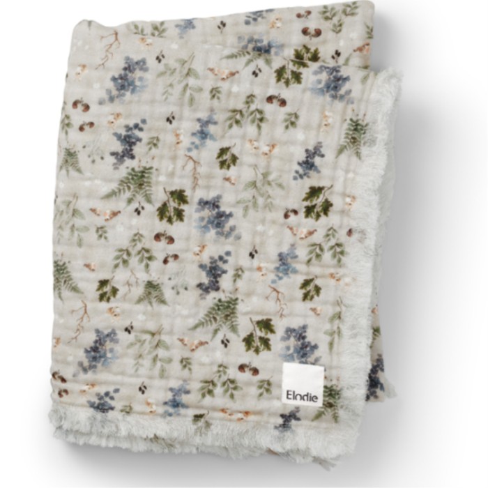 Elodie Soft Cotton Blanket med mönstret Fairytale Forest är en mjuk filt framtagen i dubbla lager av krinklad bomull som ger en värmande men samtidigt luftig känsla. Små barn brukar tycka om den ojämna ytan som ger fingrarna taktil stimulans, och de fransade kanterna är populära att pilla med.