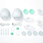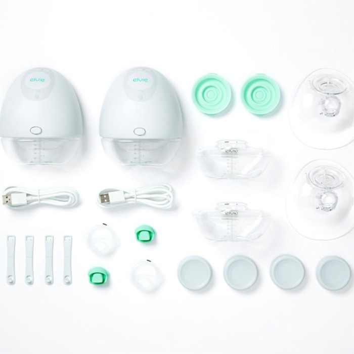 Förpackningen innehåller: 2 st Elvie Pump (pumpenheter), 4 st flaskor (150 ml), 2 st brösttrattar (24 mm), 2 st brösttrattar (28 mm), 4 st ventiler, 4 st pipar, 4 st förseglingar, 4 st lock, 4 st bh-justerare, 2 st USB-laddningskablar, 2 bärväskor.
