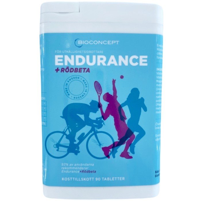 Endurance+Rödbeta ett svenskt kosttillskott med L-Arginin, L-Citrullin, rosenrotextrakt, rödbetsextrakt, magnesium och C-vitamin som är framtaget för uthållighetsidrottare.