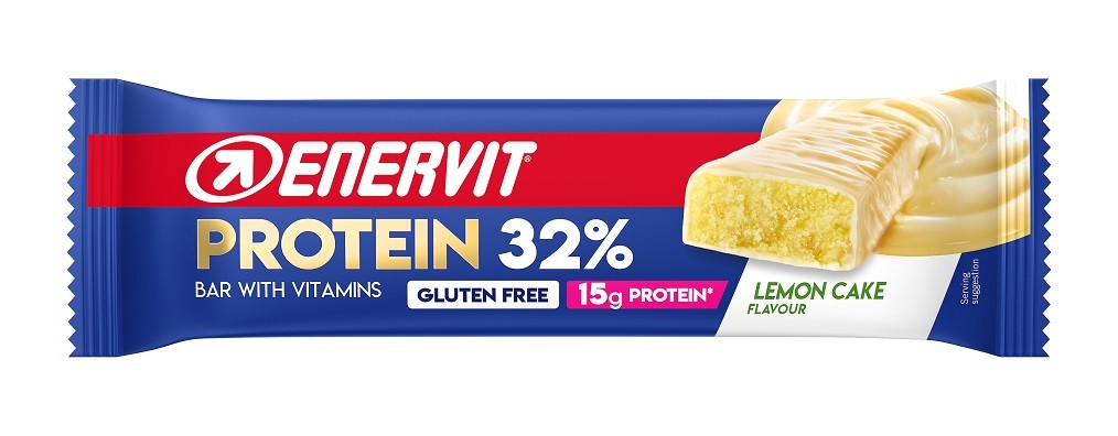 Enervit Protein Bar Lemon Cake är en proteinbar som kan tas för att ladda med protein inför eller efter ett träningspass, eller som ett mellanmål. Lemon Cake har ett överdrag av vit choklad och en smak av citronkaka. Baren är glutenfri och har ett lågt sockerinnehåll. Innehåller sötningsmedel.