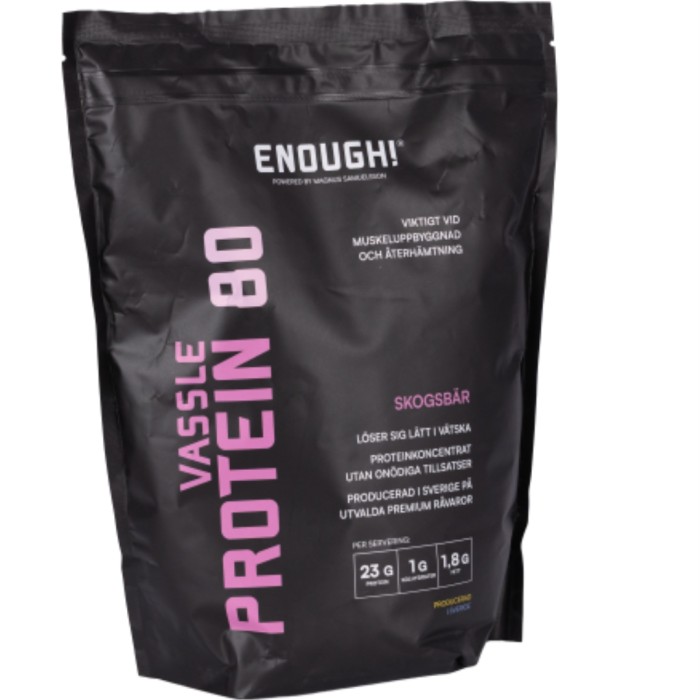 Enough Vassleprotein Skogsbär är ett fullvärdigt protein, en basprodukt för dig som tränar. Pulvret innehåller alla essentiella aminosyror och kan användas för muskeluppbyggnad. Ger samtidigt en bra mättnadskänsla. En portion innehåller 24 g protein. Innehåller svensk, spårbar råvara. Innehåller sötningsmedel.