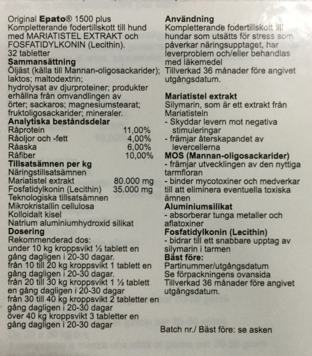 Epato 1500 Plus är ett kompletterande fodertillskott till hund med mariatistel-extrakt och fosfatidylkonin (Ledithin).