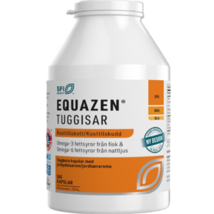 Equazen tuggisar är ett kosttillskott med en sammansättning av omega-3 fettsyrorna EPA och DHA från fisk och omega-6 fettsyran GLA från växten nattljus. Equazen tuggisar är ett enkelt sätt att få i sig fettsyror. Fiskoljan i Equazen kommer från hållbara källor av fet fisk. Innehåller sötningsmedel.