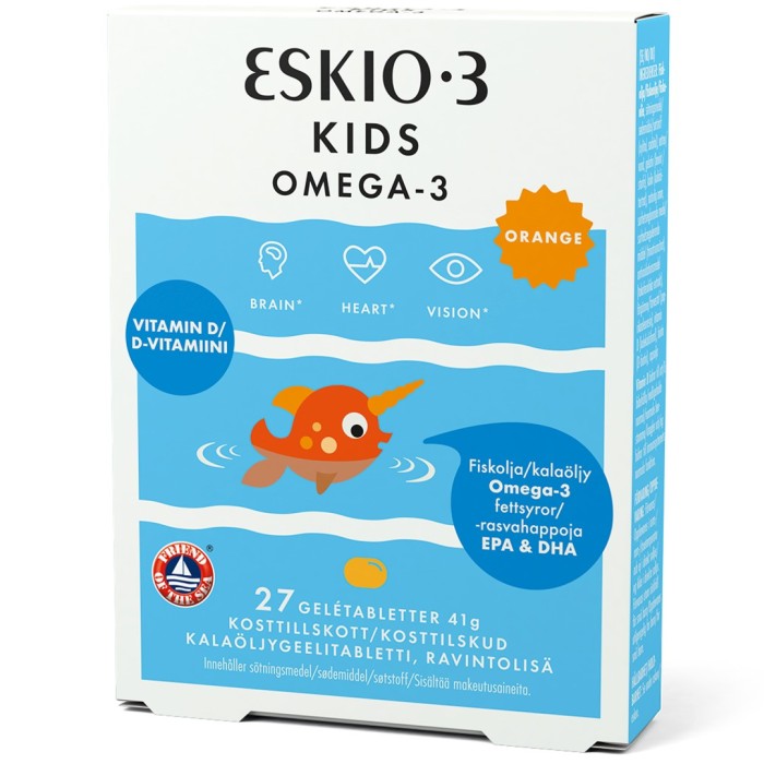 Eskio-3 Kids geletabletter är ett kosttillskott som innehåller fiskolja rik på omega-3 fettsyror. En gelétablett innehåller 54 mg EPA och 270 mg DHA.