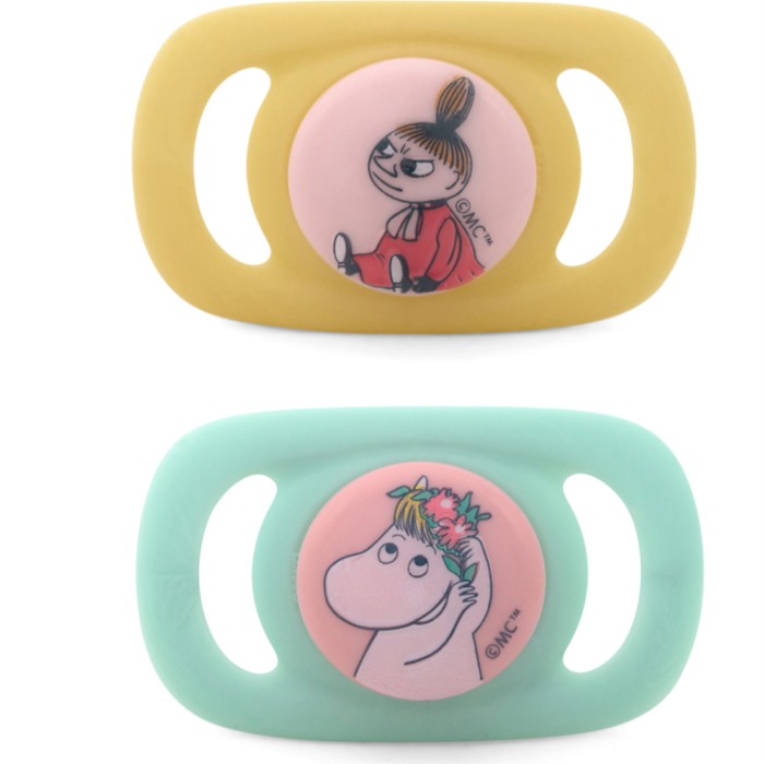 Esska Chilla nappar med sugdel i silikon och fina Mumin-motiv för barn 4-36 månader. Chilla-napparna har en ergonomisk känsla och en välventilerad sköld som motverkar hudirritation och skapar bättre luftflöde runt barnets mun.