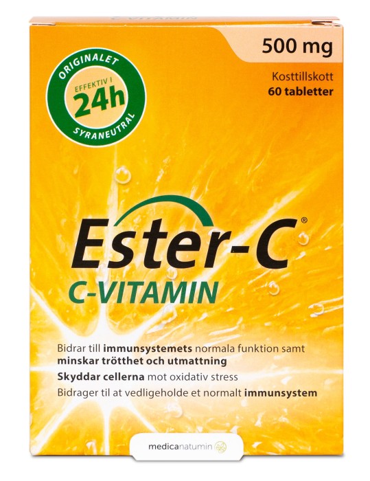 Ester-C 500 mg är ett kosttillskott med en patenterad och syraneutral form av kalciumaskorbat som genom sin kroppsfärdiga sammansättning ger ett snabbt och långvarigt upptag av C-vitamin.