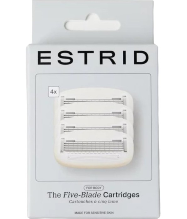 Estrid rakbladsrefill 4-pack. Rakhuvudet har 5 blad för att ge en nära rakning. Rakbladen har en återfuktande remsa med sheasmör, kakaosmör och jojobaolja.