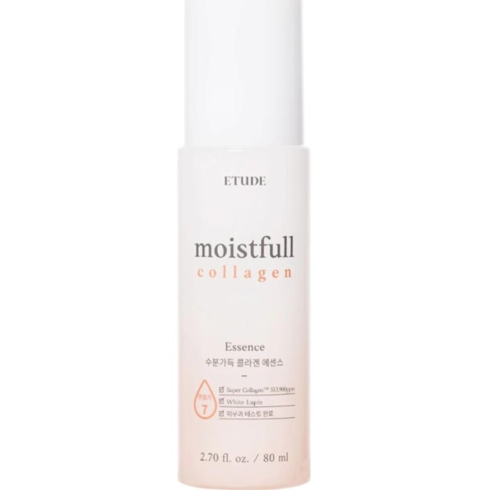 Etude Moistfull Collagen Essence är en uppstramande och återfuktande essence/serum för åldrande hud. Serumet innehåller lågmolekylärt kollagen (Super Collagen Water ™ ) för att göra huden återfuktad, mer elastisk och slätare. Kollagenet främjar hudens elasticitet, och serumet innehåller även växtextrakt från vit lupin som hjälper huden att hålla sig återfuktad. Moistfull Collagen Essence passar för känslig hud och är dermatologiskt testad och parfymfri.