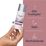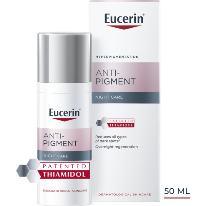 Eucerin Anti-Pigment Night Care är en nattkräm som minskar alla typer av mörka fläckar*. Krämen innehåller den patenterade ingrediensen Thiamidol® som reducerar mörka fläckar och ger en jämnare hudton från dag ett, med första synliga resultat inom 2 veckor vid regelbunden användning. Hjälper till att bibehålla en jämn hud långvarigt vid regelbunden användning.