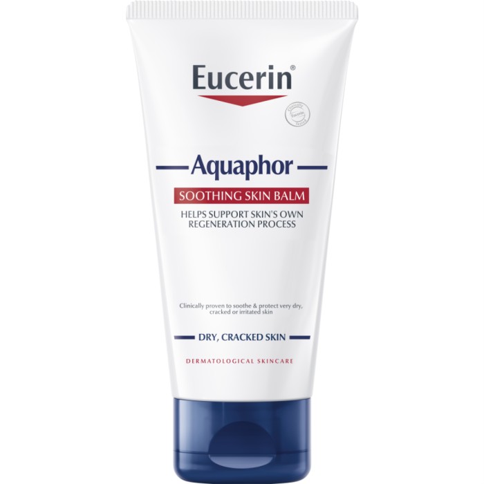 Eucerin Aquaphor Soothing Balm är en gelsalva för torr, sprucken eller irriterad hud. Aquaphor Balm ger huden SOS-vård som hjälper till att stödja hudens egna förnyelseprocess, samtidigt som den skyddar det drabbade området. Den vattenfria formuleringen lugnar och vårdar mycket torr till extremt torr, sprucken eller irriterad hud, genom att hjälpa till att stimulera hudens egna förnyelseprocess. Kan användas för torr och sprucken hud, självsprickor och torra nagelband, hälsprickor och för små barns hud. Dermatologiskt testad.