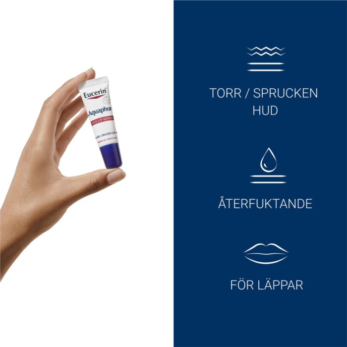 Eucerin Aquaphor SOS Lip Care ger snabb lindring till torra och spruckna läppar. Aquaphor SOS läppvård reparerar, skyddar och lugnar torra läppar på bara en minut och gör dem mjuka och smidiga.
