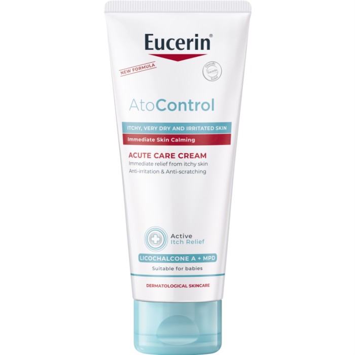 Eucerin AtoControl Acute Care Cream är en hudkräm för både kropp och ansikte som omedelbart lugnar torr hud. Krämen är framtagen för att lindra huden omedelbart och i upp till 24 timmar. AtoControl Acute Care har en vårdande formulering för att lugna huden. Krämen är även lämplig för spädbarn från 1 månad och uppåt.
