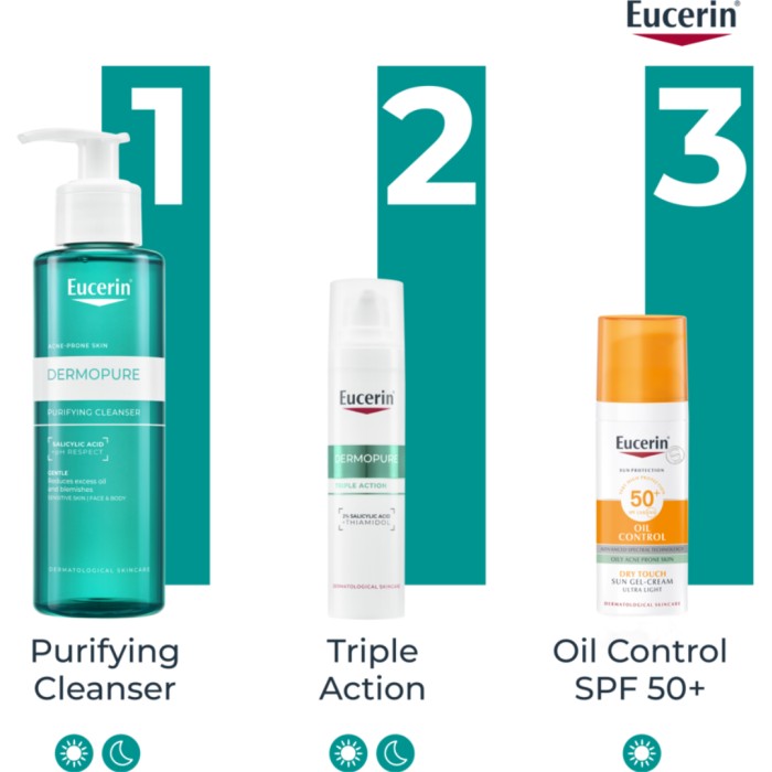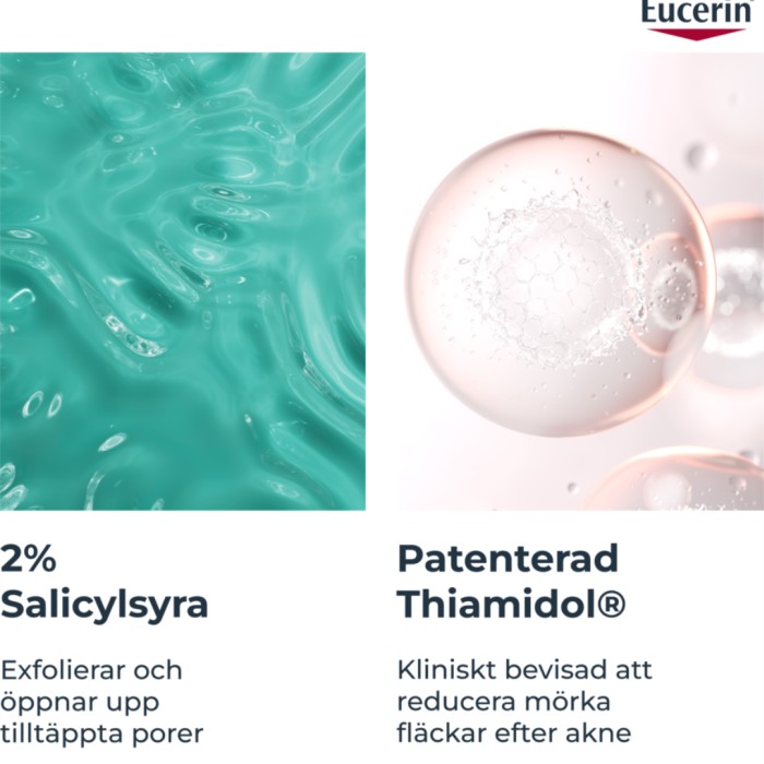 Eucerin Dermopure Triple Action Serum är ett trippelverkande, oljefritt och fuktgivande ansiktsserum som synbart korrigerar blemmor, komedoner och mörka fläckar efter akne. Serumet kan användas till fet/oljig hud och hud med tendens till blemmor och innehåller en unik kombination av dermoaktiva ämnen: 2% Salicylsyra (BHA) för att exfoliera huden och reducera fläckar, samt Thiamidol® för att minska mörka fläckar efter akne.