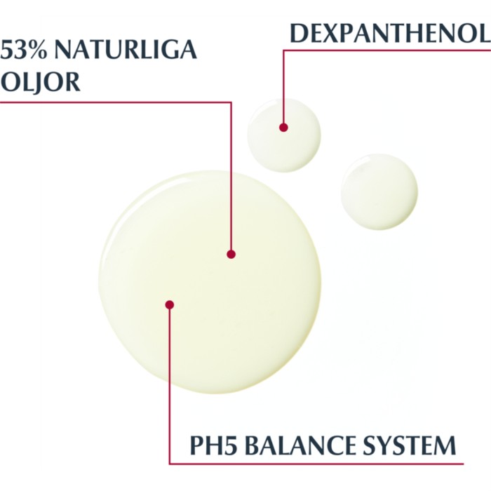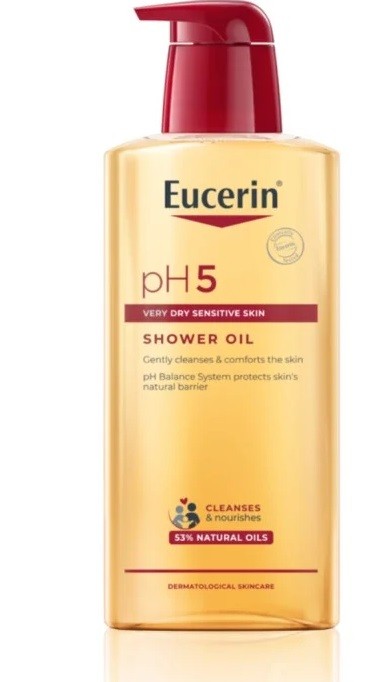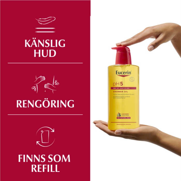 Eucerin pH5 Shower Oil är en återfuktande duscholja till kroppen. Duscholjan innehåller 53 % naturliga oljor och dexpanthenol och rengör skonsamt och respekterar hudens egna mikrobiom. Formuleringen hjälper till att vårda hudens optimala pH-värde och naturliga skyddsbarriär, och pH5 Balance System återställer och stödjer huden för att stärka hudens naturliga försvar och göra huden mindre känslig. pH5 Shower Oil skyddar och lugnar känslig hud.