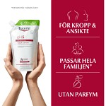 Refill med oparfymerad Wash Lotion som skyddar och lugnar känslig hud på kropp och ansikte. Refillförpackningen innehåller 65% mindre plast än originalförpackningen.