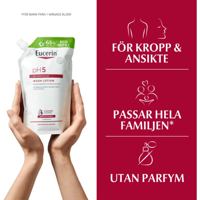 Eucerin pH5 Washlotion rengör huden skonsamt och respekterar hudens egna mikrobiom. Formuleringen med pH Balance System hjälper till att vårda hudens optimala pH-värde och naturliga skyddsbarriär. Gör att huden känns len och mjuk. Lämplig för daglig användning, även vid frekvent rengöring. Även lämplig för känslig hud, samt spädbarn från 1 månad.