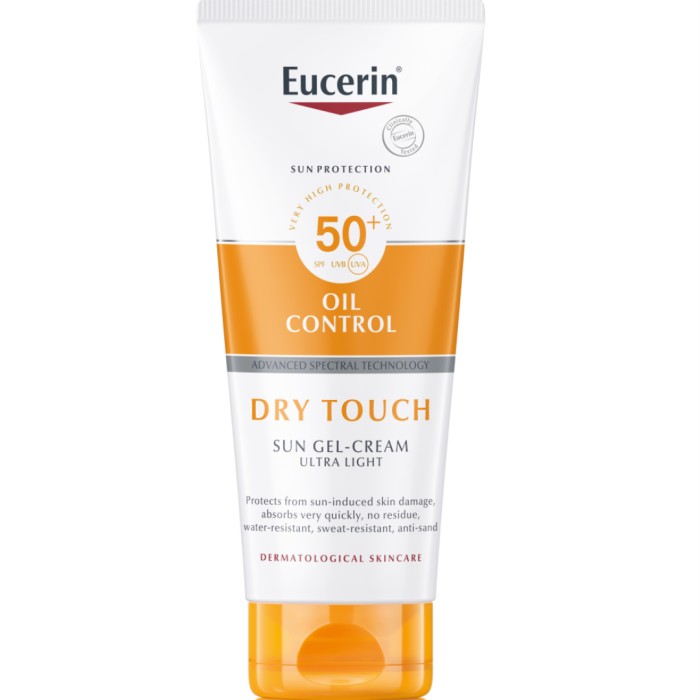 Eucerin Sun Oil Control Dry Touch Gel-Cream Ultra Light SPF50+ är en solskydds-gelkräm för kroppen med mycket högt solskydd SPF50+. UV-strålning är den största orsaken till hudskador orsakade av solen, men synligt högenergiljus (HEVIS) kan få fria radikaler att stressa huden ytterligare. Detta gelcreme-solskydd har ett extra högt UV-skydd och Eucerins Advanced Spectral Technology kombinerar dessa pålitliga bredspektrums- och fotostabila UVA-/UVB-filter med Licochalcone A för att neutralisera fria radikaler som orsakas av UV- och HEVIS-ljus.