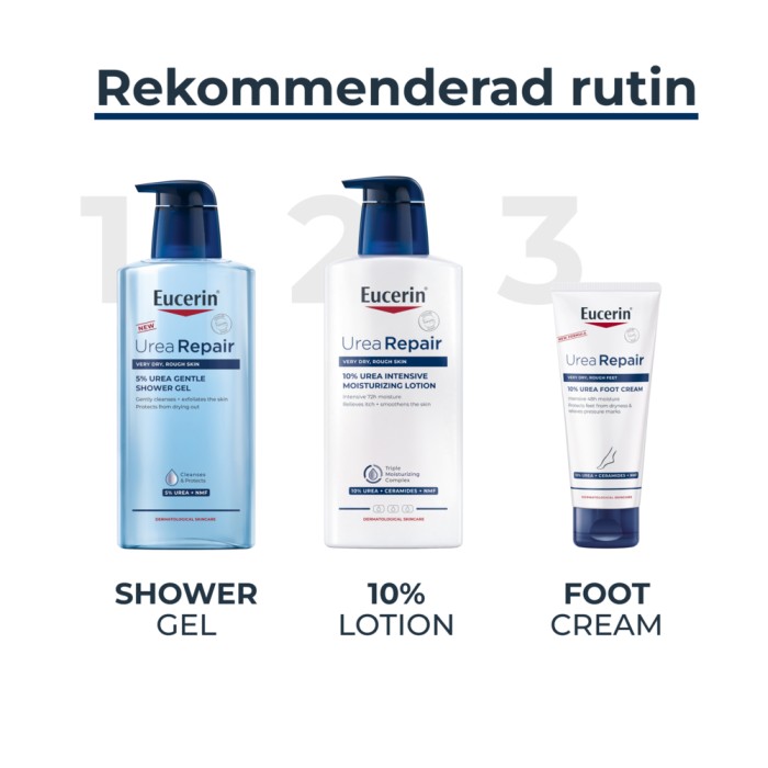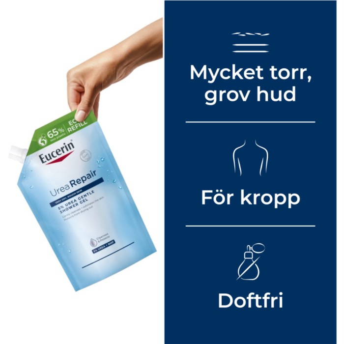 Eucerin UreaRepair 5% Urea Gentle Shower Gel är en duschgel för kroppen som rengör och exfolierar torr och grov hud mycket skonsamt, samtidigt som hudens naturliga skyddsbarriär bevaras och huden skyddas mot uttorkning. UreaRepair duschgel har en tvålfri formulering som innehåller 5% urea (karbamid) och naturligt återfuktande ämnen. Tvålen ger en skonsam men effektiv rengöring och gör att huden upplevs mjukare och känns återställd. Den lämnar inte någon stramande känsla. Utan parfym. Kliniska och dermatologiska studier visar: Mycket god vårdande effekt och hudvänlighet på mycket torr hud.