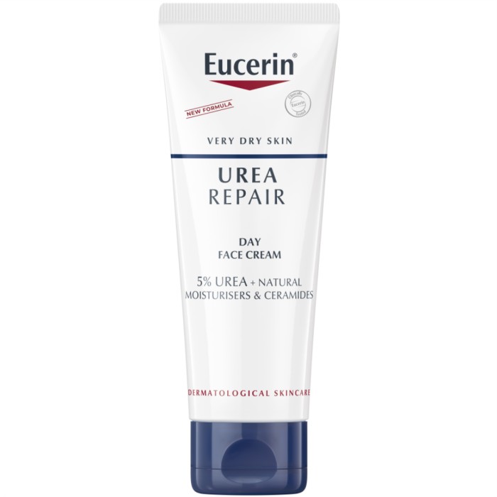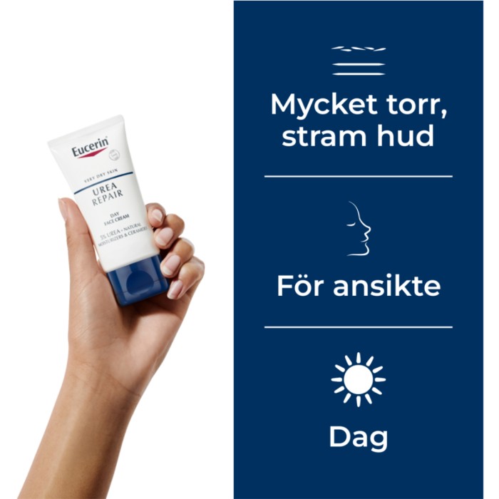 Eucerin Urea Repair Day Face Cream 5% Urea är en återfuktande och lättabsorberande ansiktskräm som vårdar huden intensivt i upp till 48 timmar. Krämen har en unik formulering som innehåller 5% urea (karbamid) och naturliga fuktgivare samt ceramider som förbättrar hudens förmåga att binda vatten, vilket resulterar i ökad fuktmängd. Kliniska och dermatologiska studier visar: Mycket god effekt och hudkompatibilitet. Den lättabsorberade ansiktskrämen ger omedelbar fukt och minskar hudens stramhet.
