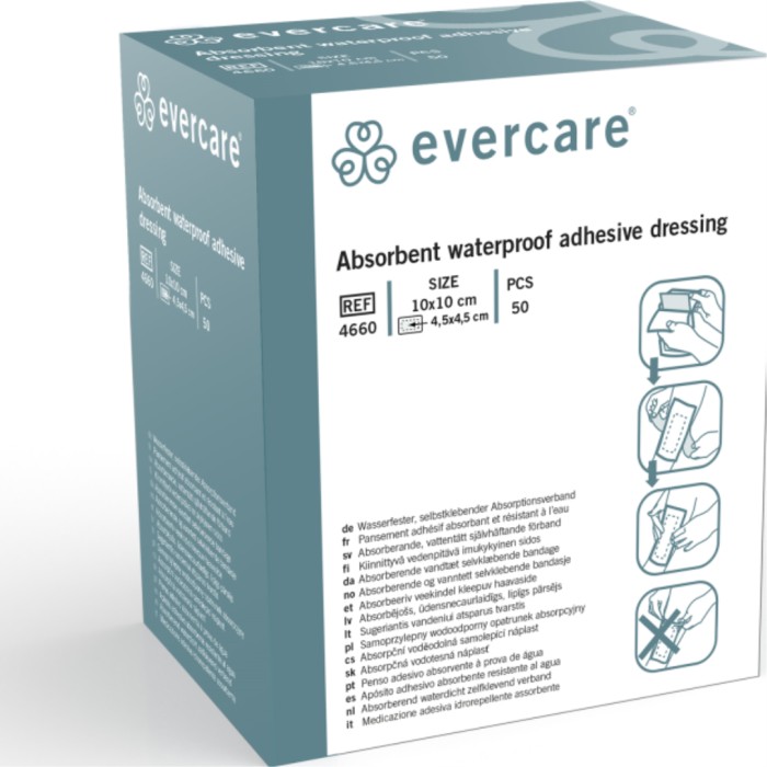 Självhäftande abs-förband från Evercare som har rundade hörn för lättare applicering. Förbandet är mjukt, elastiskt och vätskeavvisande. Har en hudvänlig häftmässa och är duschbart.