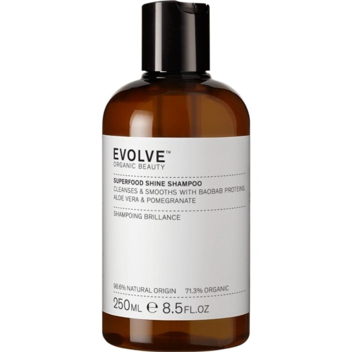 Evolve Superfood Shine Shampoo innehåller naturliga rengörande ingredienser från socker och kokosnöt som varsamt rengör hårbotten och håret utan att ta bort naturliga oljor. Proteinerna från baobab-trädet har visat sig förbättra hårets glans och styrka, samtidigt som de skyddar håret och minskar "flygigt" hår, och gör håret lättare att reda ut. Ger ett naturligt och mjukt hår. Innehåller extrakt av ekologiskt granatäpple som ger fukt och skyddar håret, samt lugnande ekologisk aloe. Vegansk.