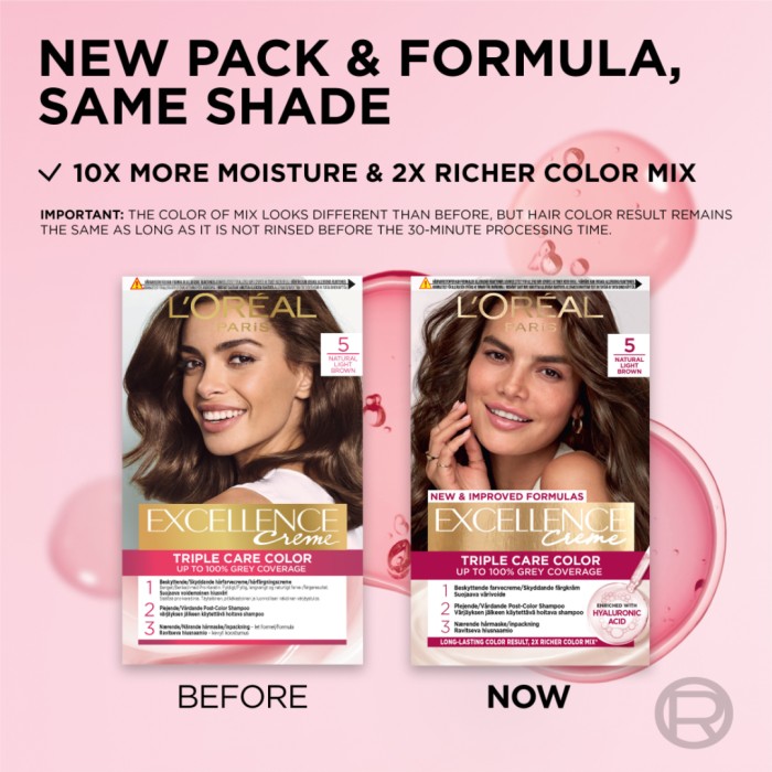 L'Oréal Paris Excellence Crème är en permanent hårfärg för dig som vill täcka gråa hårstrån och samtidigt skydda och stärka ditt hår. I serien Excellence Crème finns klassiska och eleganta hårfärger med ett fylligt färgresultat som sitter i länge. Triple Care Color-rutinen är berikad med hyaluronsyra och verkar i tre steg som stärker och skyddar håret, ger 10X mer fukt** och har en färgblandning som är 2X fastare* så att det inte droppar under färgning. Täcker gråa hårstrån upp till 100% och passar alla hårtyper. OBS! Färgblandningen kan se mörkare ut vid applicering än tidigare formuleringar men slutresultatet är samma så länge verkningstiden på 30 minuter följs.