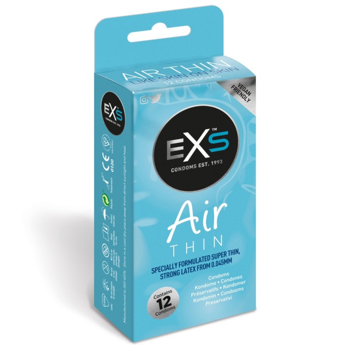 EXS Air Thin är kondomer tillverkade med en unik latex-blandning som gör det möjligt att göra en extra tunn kondom utan att inskränka på säkerheten. Förpackningen innehåller 12 st anatomiskt utformade kondomer i naturlig latex som är behandlade med silikonbaserat glidmedel.