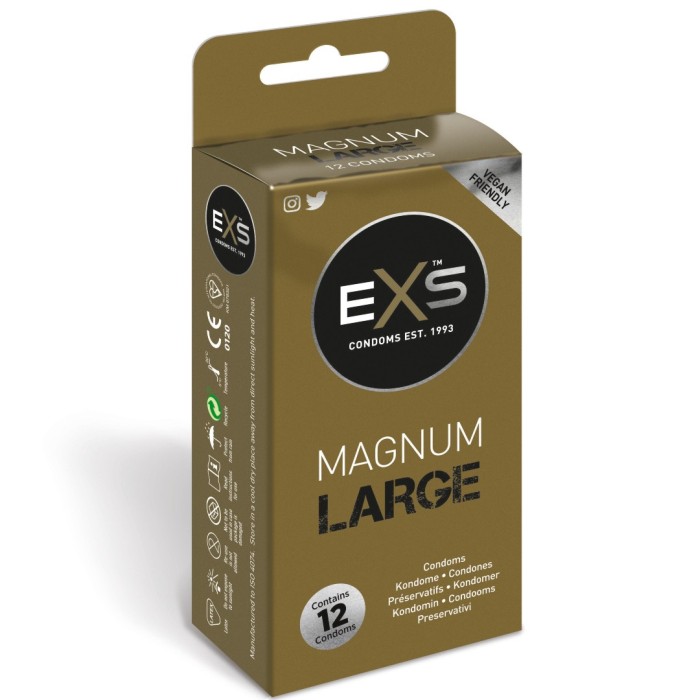 EXS Magnum Large är en kondom med något större passform. Förpackningen innehåller 12 raka kondomer i naturlig latex som är behandlade med silikonbaserat glidmedel.