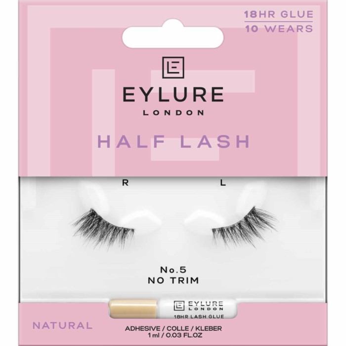 Eylure No.5 är en mörk och söt halvfrans som ger dig en "cat eye look". De är återanvändbara upp till 10 gånger, och varje franspaket inkluderar ett latexfritt franslim, som ger ett säkert fäste i upp till 18 timmar.