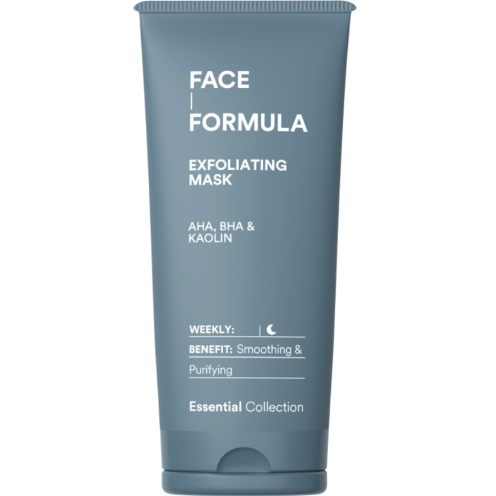 Face Formula Exfoliating Mask är en krämig lermask med AHA- och BHA-syra för en djup rengöring och effektiv exfoliering. Kaolin och bentonit-lera balanserar huden och absorberar skonsamt talg och orenheter, samtidigt som den bevarar fukt. Niacinamid jämnar ut hudtonen, minimerar synlighet av porer, reducerar pigmenteringar och stärker hudbarriären. Glykolsyra och mandelsyra exfolierar skonsamt, främjar cellförnyelsen och salicylsyra löser upp tilltäppningar och minskar orenheter. Azelainsyra ljusar upp, reducerar rodnad och hyperpigmentering och reglerar talgproduktionen med sina antibakteriella egenskaper.