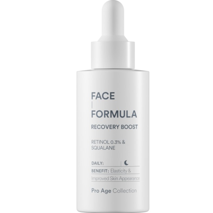 Face Formula Recovery Boost är ett serum med 0,3 % retinol - ett oljaserum som hjälper huden att återhämta sig under natten. Oljeserumet ger huden fyllighet och motverkar fina linjer, rynkor och hyperpigmenteringar.