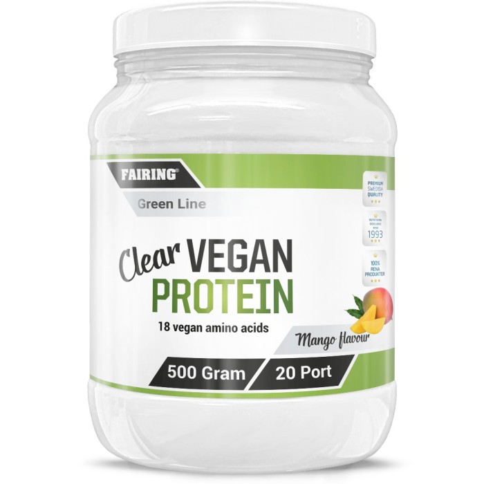 Fairings Clear Vegan Protein är ett pulver till en klar dryck med en god smak av mango. Innehåller 18 vegansäkra aminosyror (82% protein) och kan tas som ett komplement till en vegetabilisk kost för att hjälpa upp proteinintaget. Blandas med vatten.
