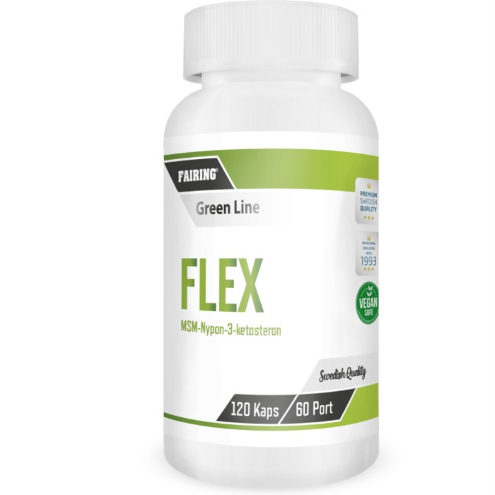 Fairing Flex är ett kosttillskott med kapslar med en blandning av MSM, Cissus Quadrangularis och nyponpulver. MSM (Metylsulfonylmetan) är en organisk svavelförening som förekommer naturligt i kroppen.