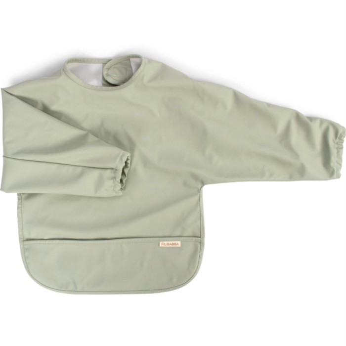 FILIBABBAs haklapp med ärmar skyddar det lilla barnets kläder vid den kanske lite kladdiga måltiden. Den mjuka ytan gör den bekväm att bära och lätt att rengöra. Den rymliga fickan i botten fångar upp mat och dryck som spills, och med elastiska ärmslut och kardborrefäste i nacken sitter haklappen perfekt. Haklappen är tillverkad av polyester med en mjuk PU-beläggning vilket gör den vattentät. Torkas enkelt av med en fuktig trasa och maskintvättas i 30 grader vid behov.