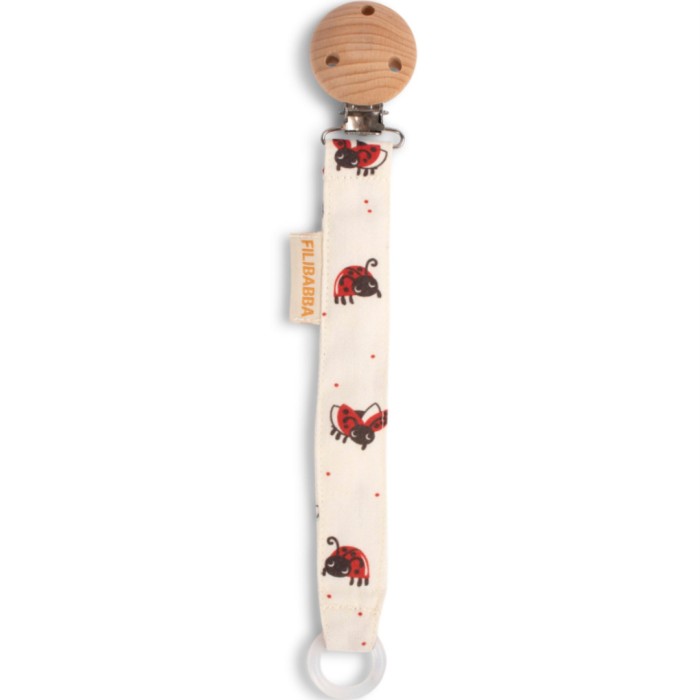 FILIBABBAs praktiska napphållare är tillverkad av GOTS-certifierad ekologisk bomull. Napphållaren har en fin träknapp med metallklämma som fästs på barnets kläder så att nappen alltid är nära till hands och inte faller på marken. I andra änden fästs nappen enkelt i napphållarens silikonring.