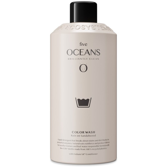 Five Oceans flytande tvättmedel får sin tvättkraft från en naturlig tensid baserad på socker. Kulörtvättmedlet för färgade textilier innehåller effektiva enzymer som bryter ned fläckar. Det innehåller Oatium XR™, en ingrediens som stärker textiliernas fibrer för att skydda kläderna från slitage. Det vrdar fiberstrukturen för att ge en mjukare textur och känsla.